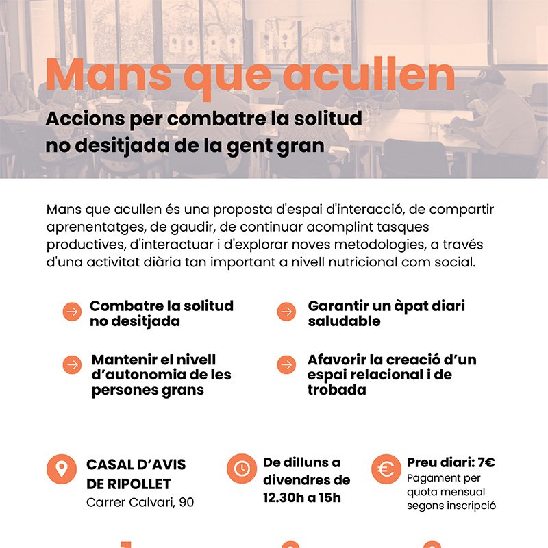 Oferim espais càlids i propers on combatre la solitud no desitjada i fomentar l’autonomia de la gent gran. Al Casal d’Avis aprofitem una activitat diària com és dinar per fer petites tasques conjuntes, crear vincles i garantir un àpat saludable de dilluns a divendres.